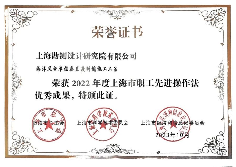 近日,在上海市總工會、市科委和市經(jīng)信委聯(lián)合開展的2022年度上海市職工合理化建議和先進(jìn)操作法優(yōu)秀成果征集命名工作中,三峽上海院深遠(yuǎn)海海上風(fēng)電建設(shè)關(guān)鍵技術(shù)科技創(chuàng)新團(tuán)隊(第一發(fā)明人:張權(quán))的“海洋風(fēng)電單樁垂直度糾偏施工工法”榮獲2022年度...