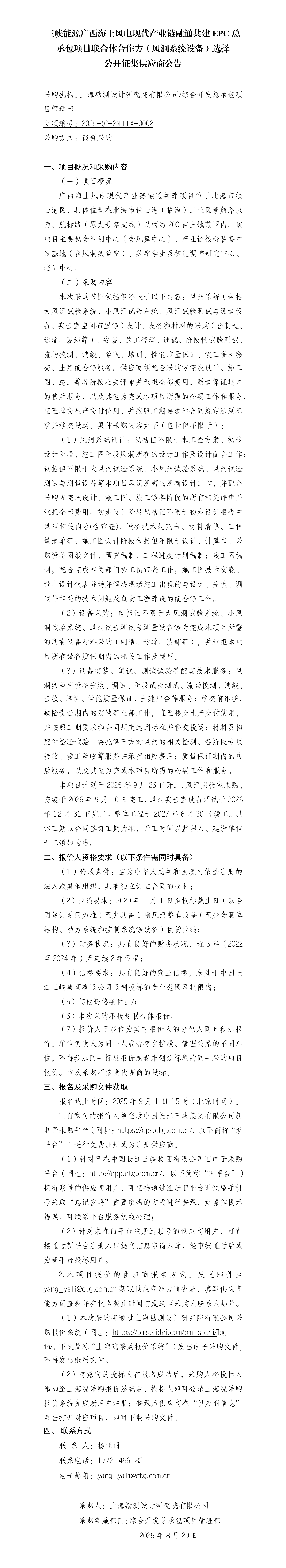 三峽能源廣西海上風電現代產業鏈融通共建EPC總承包項目聯合體合作方(風洞系統設備)選擇公開征集供應商公告