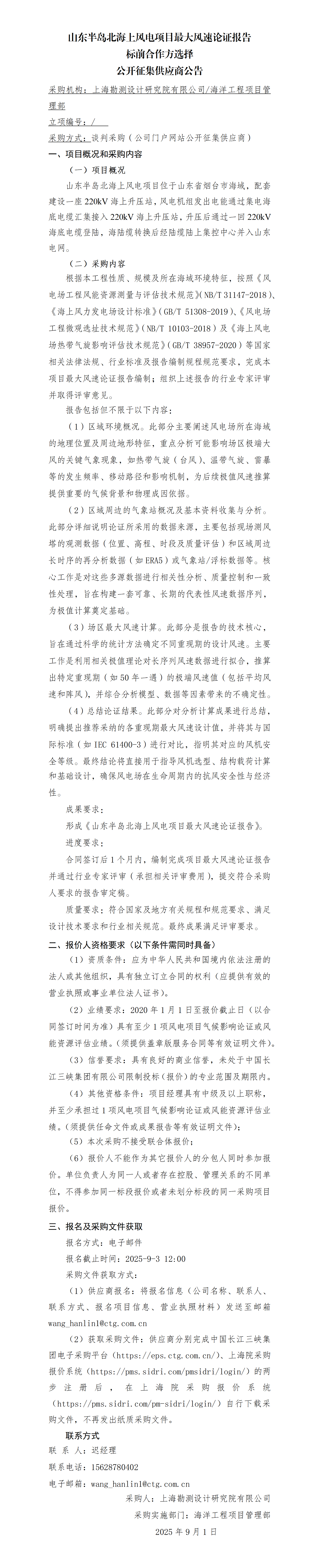 山東半島北海上風電項目最大風速論證報告標前合作方選擇公開征集供應商公告