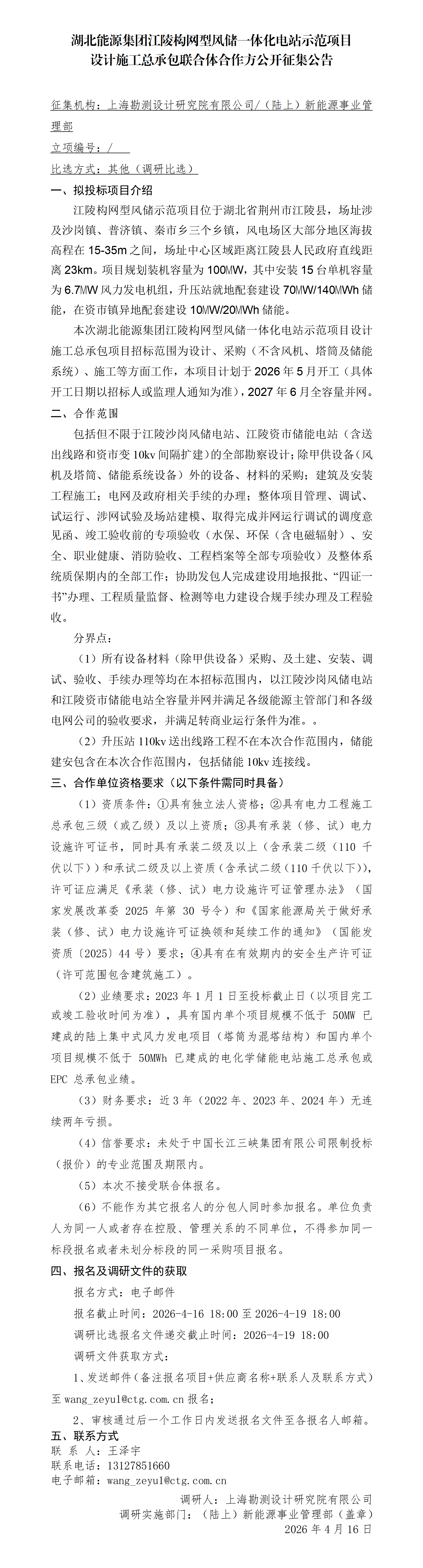 湖北能源集團江陵構網型風儲一體化電站示范項目設計施工總承包聯合體合作方公開征集公告
