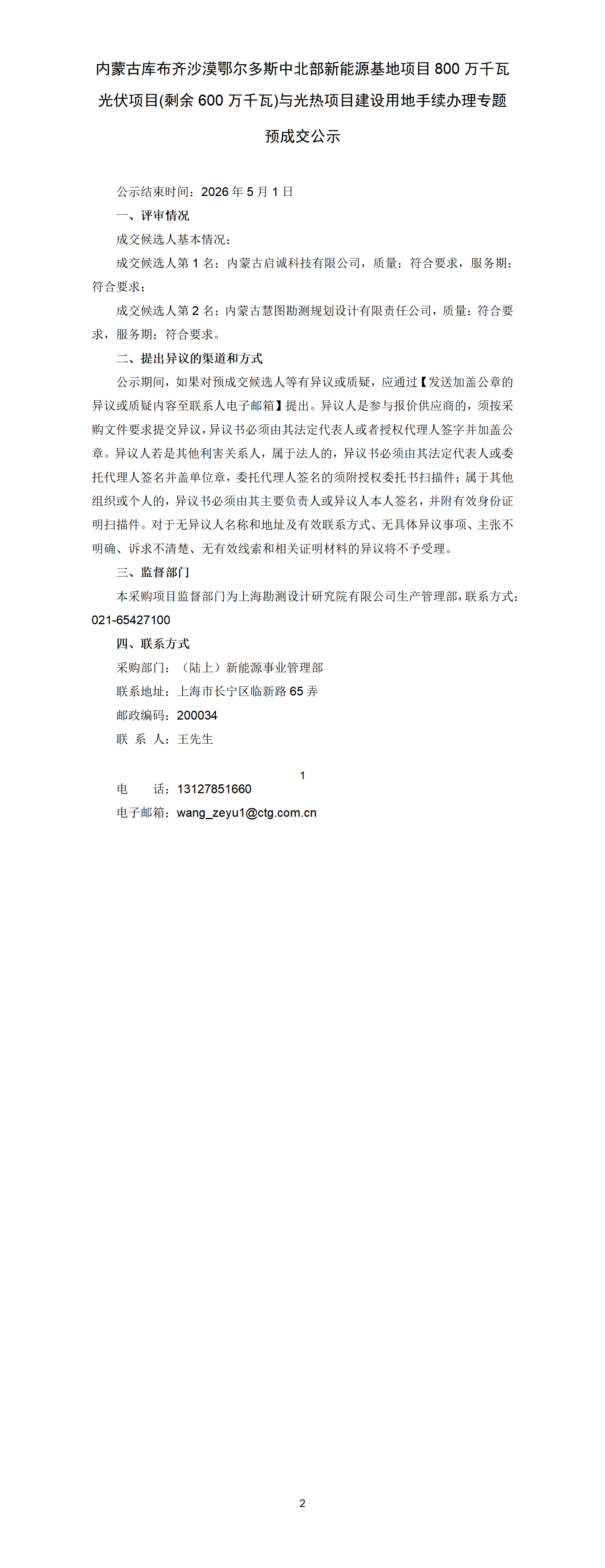 內蒙古庫布齊沙漠鄂爾多斯中北部新能源基地項目800萬千瓦光伏項目(剩余600萬千瓦)與光熱項目建設用地手續辦理專題預成交公示